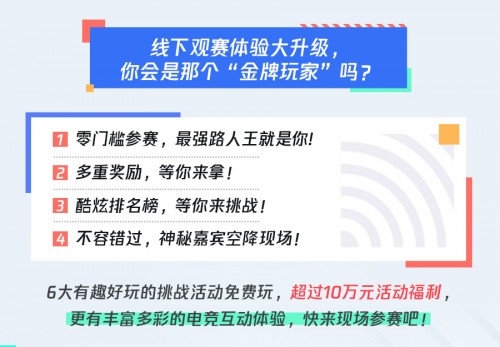 在比赛玩法上,TGA首次推出“金牌玩家”赛事,旨在让普通玩家或游戏爱好者能更多地参与、体验电竞赛事,最强路人玩家将在现场“一战成名”。7月15日起,玩家可以通过现场报名的方式,参与“金牌玩家”英雄联盟、王者荣耀、欢乐斗地主、欢乐麻将、跑跑卡丁车手游、舞力全开中国版六个项目的比赛。同时,比赛提供排行榜与巅峰时刻两种玩法,现场完成挑战即可参与抽奖。金牌与否,由战绩说话!
