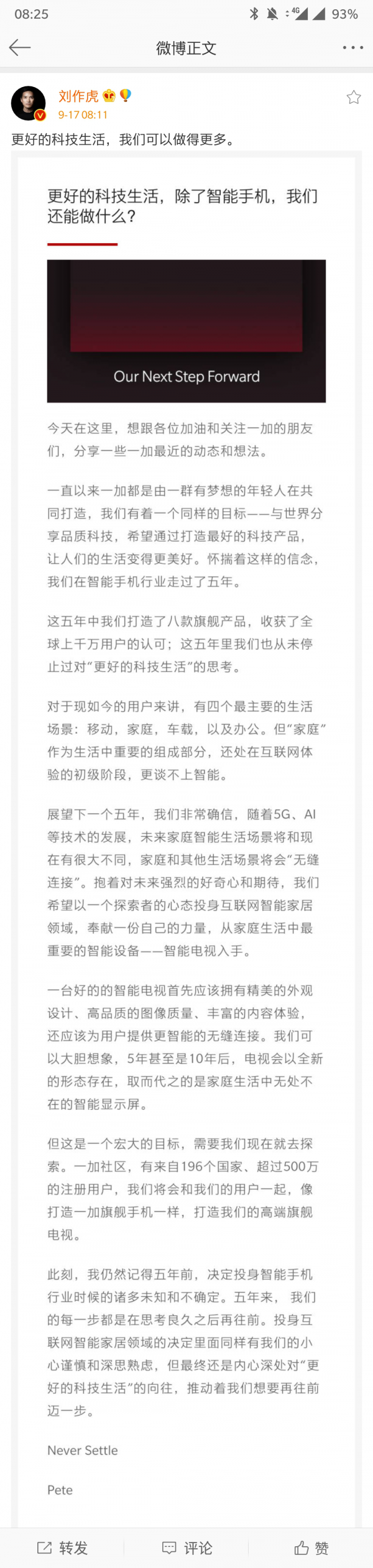 自成立以来,一加一直致力于与世界分享品质科技,此次刘作虎也在他的长微博中提出了对“更好的科技生活”的看法。他认为,随着5G、AI等技术的发展,家庭智能生活场景将和现在有很大不同。如今用户生活主要有四大互联网应用场景:移动、家庭、车载和办公。家庭作为生活中非常重要的场景,还处在较为初级的阶段。一加科技进军互联网智能家居领域,希望通过一加电视,让用户在家庭场景中也能体验到完整的互联网用户体验,享受“更好的科技生活”。