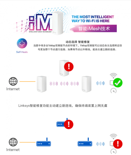 这里需要指出的是,Velop双频版在体验上带来的提升同样也离不开硬件的支持,主要提升就在于其组网能力的不同。相较于传统路由器,Velop双频版每台设备的配置完全一样,除了在硬件上实现了多种组网方式,在使用中还带来了网络动态调整、节点智能修复的能力。例如有节点意外断线,Velop双频版就可以自动寻找信号强的节点进行连接,从而保证了稳定的网络服务,这对于曾经智能有线组网的传统路由系统来说是无法企及的。