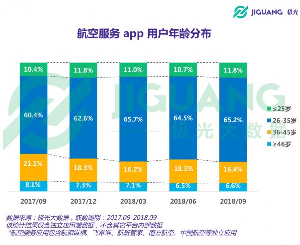 在过去一年,航空服务app的整体用户年龄结构显示出更加年轻化的趋势。截至今年9月份,航空服务app中25岁及以下用户的占比为11.8%,较去年同期增长1.4%。26-35岁用户的占比为65.2%,与去年同期相比增长了4.8%。