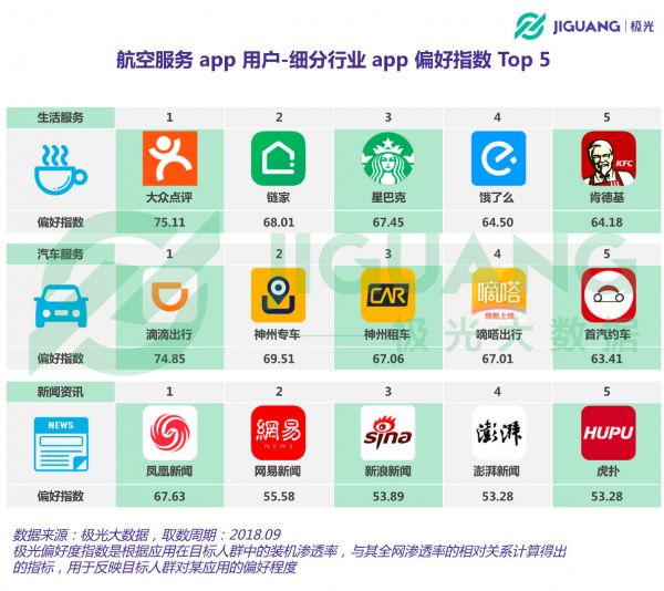 在生活服务类app中,航空服务人群最偏好大众点评、链家和星巴克。在汽车服务领域,最受目标人群偏好的是滴滴出行、神州专车和神州租车。而在新闻资讯类别app中,凤凰新闻、网易新闻和新浪新闻有着最高的用户偏好度。