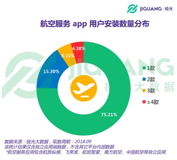 截至今年9月份,有75.21%的用户仅在设备上安装1款航空服务类app,安装数量为2款的用户占比为15.3%,3款的用户占比为5.11%。与此同时,也有4.38%的用户对航空服务app的安装数量达到4款及以上。