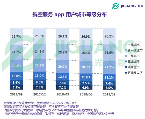 在航空服务app用户中,一线城市用户占比为26.2%。新一线和二线城市用户占比依次为26.6%和21.2%,二线及以上城市的合共占比达到74%。与去年同期相比,航空服务app用户对新一线和二线城市的集中程度有所提升。
