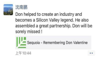 “唐瓦伦丁协助开创了一个行业,并成为硅谷的传奇。他建立了良好的合作关系,将被深深怀念!”杉资本全球执行合伙人、红杉资本中国基金创始及执行合伙人沈南鹏在朋友圈表示悼念。