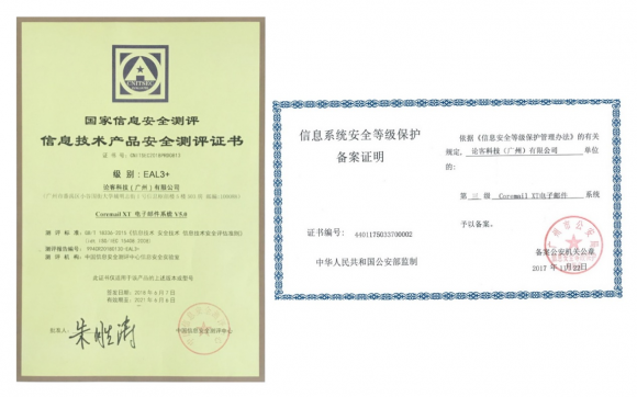 经过中国信息安全测评中心的严格测试与评估,Coremail论客电子邮件系统Coremail XT V5.0获得《国家信息安全测评 信息技术产品安全测评(级别:EAL3+)》证书。同时,以92.53的高分成绩通过了信息系统安全等级第三级的测评。