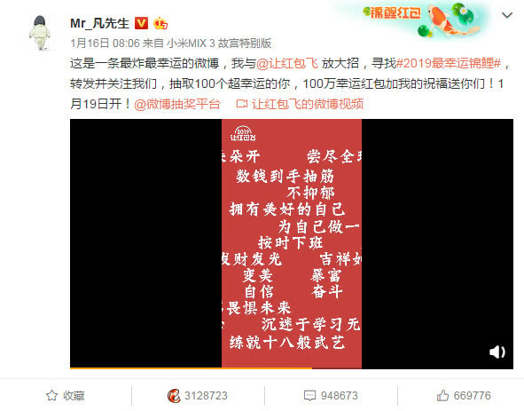 说到强大阵容联动,我们看到在今年的#让红包飞#活动中,微博邀请了央视新闻、头条新闻等多家媒体机构,吴亦凡、张雨绮、Angelababy、黄晓明、张一山、罗志祥等多位明星名人、多名微博大V、多家知名企业联动开启锦鲤活动,形成了涵盖政企明星大V的强大锦鲤联动阵营。早在1月16日,吴亦凡就公布了2019#让红包飞#首个锦鲤活动——100名网友平分100万元,并专门录制新年祝福视频送给微博网友。而后续还会有更多的媒体、明星、大V、企业锦鲤活动的轮番来袭。
