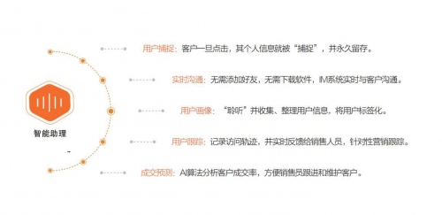 喜推智能小程序基于人工智能技术研发而成,客户的每一次行为轨迹都能与销售员产生关联。例如客户的点击、浏览、转发、咨询等行为,将实时推送给销售员,以便销售员做出判断、及时跟进,而这一切都是以微信通知的形式,直接推送给销售员,降低了被销售员遗漏的可能性,做到客户咨询“秒回”的即时性营销。