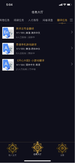 夜神猎人从去年9月份公测以来,持续更新,不断完善产品,在自由职业者这片红海中,夜神猎人硬生生地靠一己之力创造了一片蓝海,近日再推新版V1.1.10,在V1.1.10中新增翻译任务模块,雇主可以通过线上的形式发布翻译任务,译者可以采用线上竞标的形式,参与任务竞标,让翻译兼职真正的从线下走到线上。