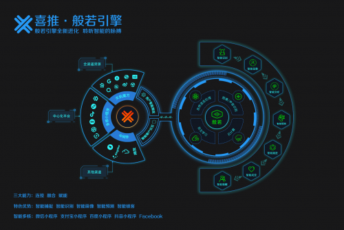 从以上三大用户入口载体所捕捉到的的用户数据将统一沉淀到企业数据库。然后,般若算法引擎将对这些数据进行整理、挖掘和分析。般若是喜推科技拥有自主知识产权的人工智能算法引擎,拥有自然语言处理能力、图像/音频识别能力、云计算能力、自主学习能力。