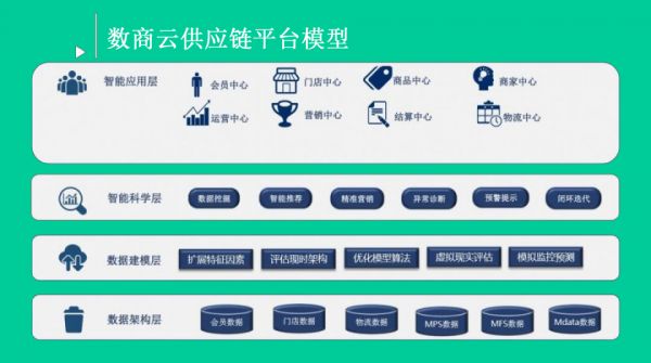 智能应用层: 通过科学层给出科学建议后,会智能应用到整个门店的经营,以及服务商管理的各个中心,包括有用户、门店、结算、营销物流等等。