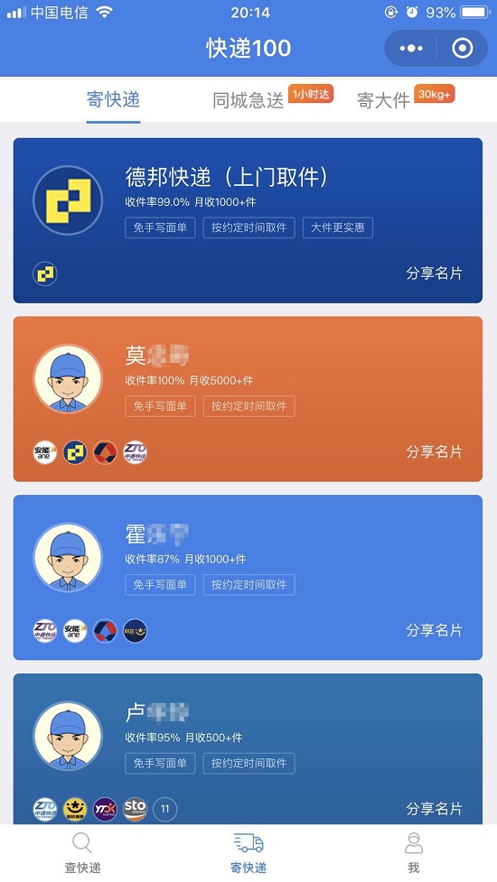 快递已成为我们离不开的生活服务,工作文件、网上购物都对时间和效率有要求。快递100上线“快递员查询服务”,在微信小程序搜索“快递”或“快递员”,就会智能显示我们附近的快递员和网点,多个快递员可供选择。选择合适的快递员后可以直接点击下单寄件,三个步骤操作简单:搜索“快递员”——选择快递员——下单寄件。此外,快递100 上线“同城急送”1小时达和“寄大件”业务,有效细分快递服务,更好的满足用户需求。