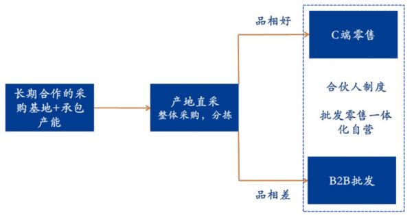 谊品生鲜向上游付订金直接采购,承包产能,比如柚子是包下整个山头,或者包下十万只蛋鸡,然后在产地分级,在产地建立分拣中心和加工中心,在每个城市建立仓储配送中心。