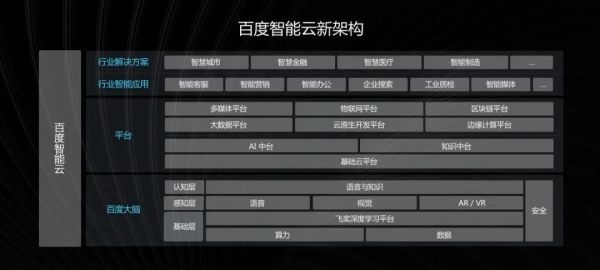 百度智能云2020年第一季度内部会上,王海峰提出了新的发展战略:“以云计算为基础,以AI为抓手,聚焦重要赛道”。并且为了更好地执行新战略,百度智能云还对业务架构进行了调整,底层是百度大脑,中间层是基础云平台、AI 中台、知识中台等组成的平台,最上层是智能应用和解决方案。