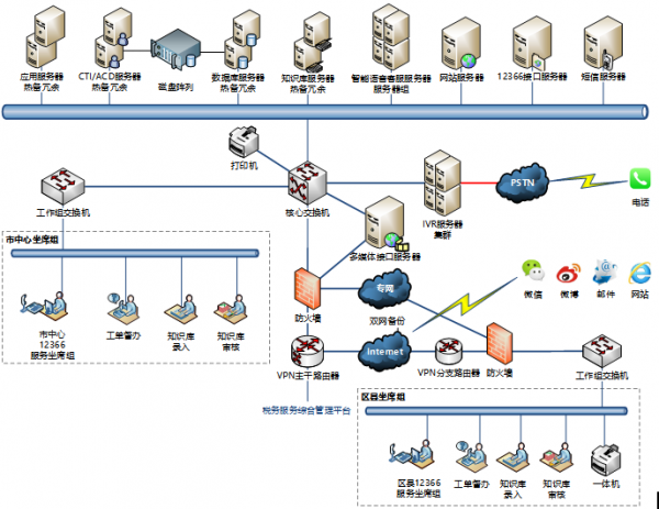 基于微信、网站、微博、APP、短信、电子邮件、传真等渠道的服务接口,受理咨询、建议、投诉服务,由坐席以及业务系统后台转换并形成统一工单,微信、网站、APP渠道提供在线交流和工单进展查询功能,微信、微博、APP渠道提供政策、新闻推送功能。