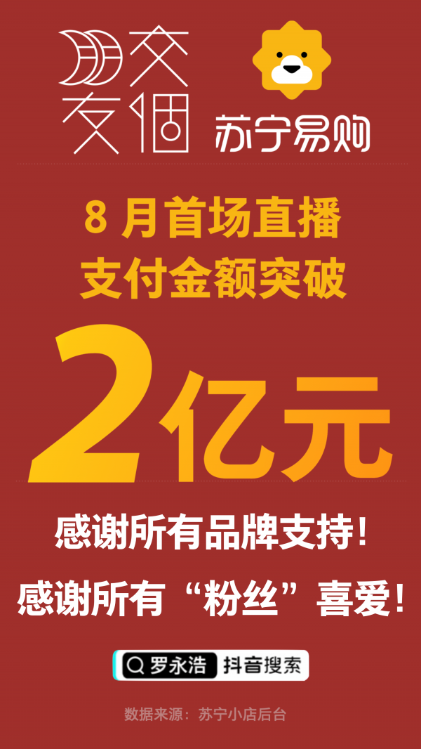 昨天(7日)晚上,罗永浩开启八月份第一场直播,也是担任苏宁易购“品质体验官”的首场苏宁专场直播,直播90分钟,打破4月首秀1.2亿记录,凌晨12点,销售额冲顶,破2亿。罗永浩,这次“抖音一哥”的头把交椅真的稳了。