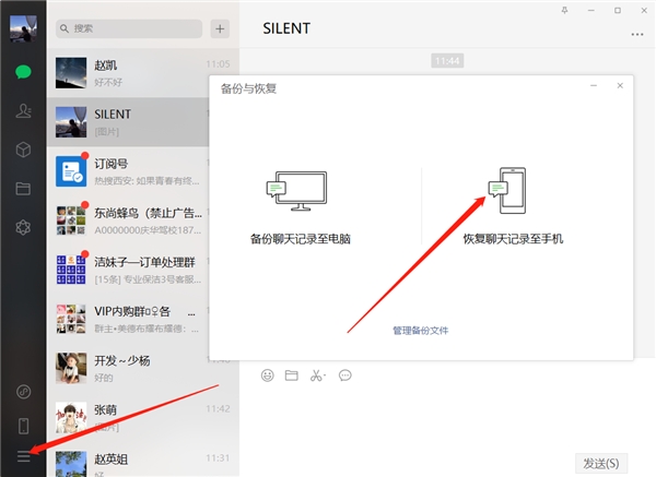 具体操作步骤:微信登陆电脑页面左下角三条横杠点击打开,选择备份与恢复,然后点击恢复聊天记录至手机上面。这样操作下来就可以把备份到电脑上面的微信记录成功恢复到手机上面。
