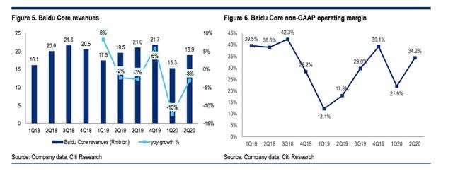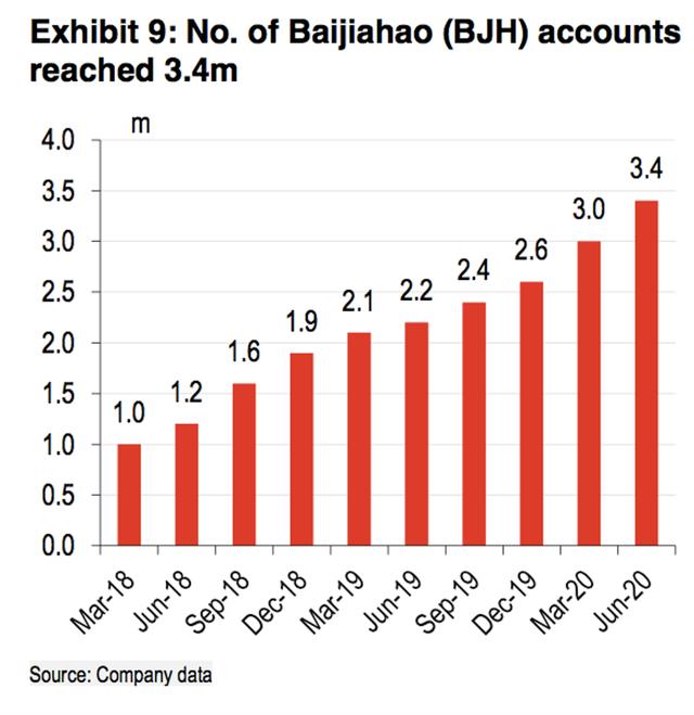 从财报数据来看,百度的上述战略已经颇见成效。2020Q2,百家号内容创作者数量同比增长52%至约340万;百度智能小程序月活跃用户数达3.39亿,同比增长25%,智能小程序的数量达到去年同期的5倍以上;同时,在医疗广告复苏等的推动下,托管页面在百度核心中的收入占比从上季度的20%提升至30%,瑞穗银行(Mizuho)认为这是百度盈利的一个积极指标。