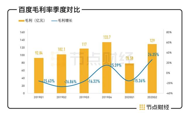 财报显示,从2019Q2到2020Q2,百度毛利增长率从-26.86%提升至26.35%。这同时带动百度App收入在第2季度实现两位数增长,显著超过同行。
