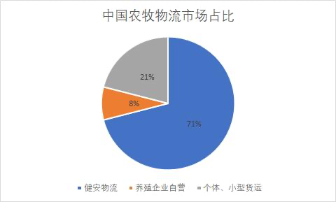 但是,目前中国农牧运输市场主要由养殖企业的自营物流、个体、小型货运公司以及健安物流等组成。其中大玩家只有健安物流一个,占据了71%的市场份额,其它个体、小型货运以及养殖企业自营等“大多数”,仍处在“单打独斗”的野蛮生长状态。