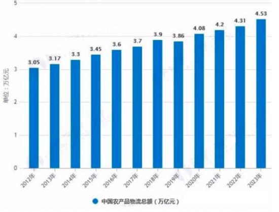 据前瞻产业研究院发布的报告数据显示,预计2020年中国农产品物流总额将突破4万亿元,并在2023年预计将达到了4.53万亿元左右,从2019到2023年均复合增长率约为4.08%。可见,中国农牧物流市场规模以及增长潜力很大。