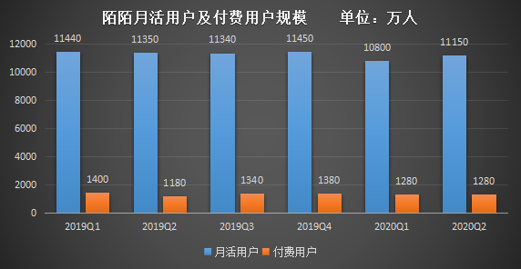 根据财报数据来看,截至2020年6月陌陌主App月度活跃用户为1.115亿,与第一季度的1.080亿MAU(月活用户)相比,出现了一定上涨的趋势,但与去年同期的1.135亿MAU相比整体还是下滑的。综合2019Q1以来各个季度陌陌月活用户以及付费用户的数据来看,其增长明显已经见顶了,甚至出现了用户量下滑的情况。