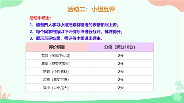 提供关键原则,及时引导讨论方向: 在学生讨论期间,何老师及时发现学生探究的问题,并予以适时干预,展示讲解了素材精选的5大原则,让学生反思讨论筛选的内容是否符合标准,并再次组织学生根据素材精选原则进行探究,将讨论筛选的素材填写在老师下发的纸质思维导图中。