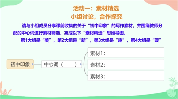 发布探究任务,明确合作规则与要求: 前期的热身活动完成后,何老师带领学生进入了小组合作探究阶段。4人为一组,每两纵列为一大组,其中每一小组要安排“组织讨论者”、“展示发言者”、“记录者”、“拍照上传者”各1 人。小组成员分享课前收集的关于“初中印象”的写作素材,并围绕教师分配的中心词,对收集到的素材进行筛选,完成 “素材精选”思维导图,每个大组分配到的中心词分别是“美”、“新”、“趣”、“暖”。