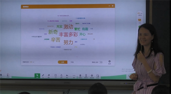 发表观点谈感受: 为进一步引导学生在自主探究后思考初中生活的变化,何老师抛出了“初中生活给你的最深刻的感受”这一问题,通过希沃易课堂发表观点功能,引导学生用简洁明了的词语或短语进行描述,让每一位学生的感受都能快速呈现与分享,而后带领同学共同体会其他同学的观点,并邀请学生来详细描述观点含义。