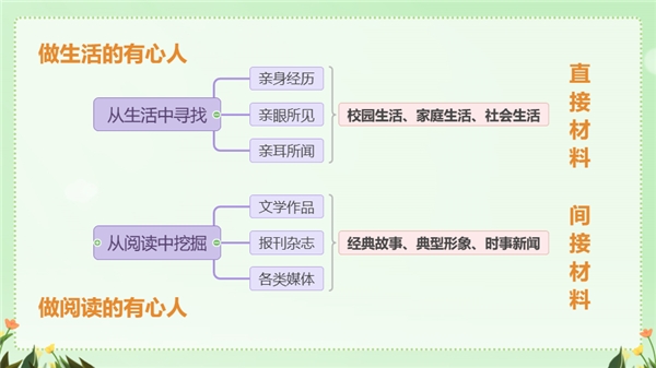 关键内容梳理,总结课堂精华: 通过小组合作自主探究,学生掌握了如何寻找并筛选素材的方法与技巧。在此基础上,何老师贴合教学重点,与学生共同梳理出作文写作中可作为写作素材的直接材料与间接材料,分别可以从生活以及阅读中挖掘,并提示学生要留心生活、多阅读积累,处处留心皆素材,积累精选方能成妙文,再次点明课程主题。