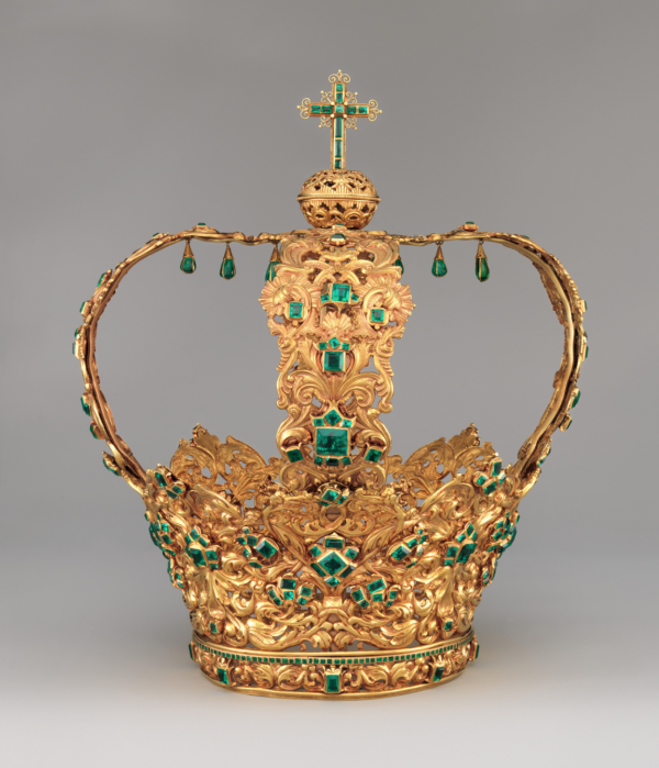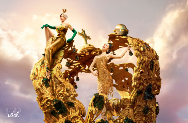 被吉利姐和钟楚曦作为超现实雕塑背景的安第斯皇冠,原作是16世纪最知名的黄金珠宝制皇冠。由西班牙金匠设计制作,代表着同时代最高的珠宝设计制作水平。