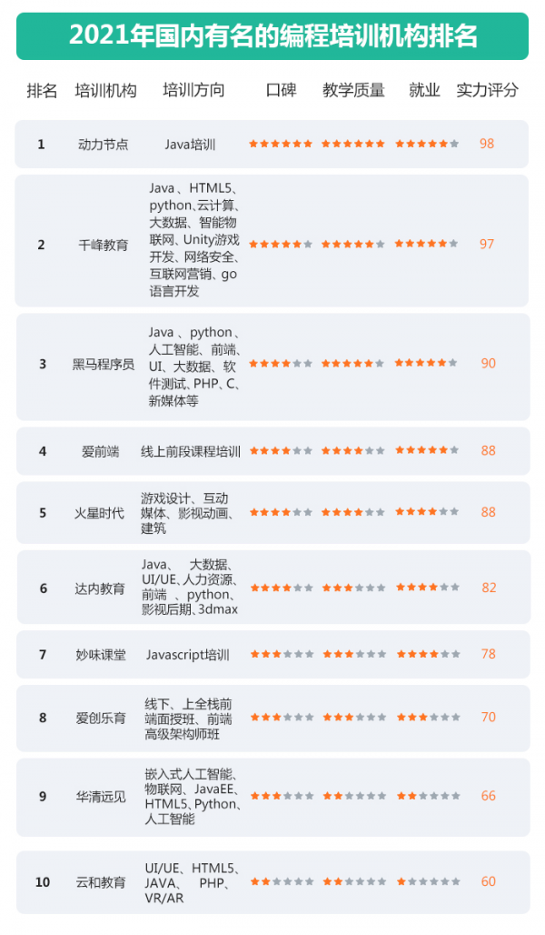 从市场发展前景来看,在国家和地方政策利好的驱动下,编程课程在学校下沉,另一方面,大批编程机构崛起,对编程开发行业动向感知的同学蜂拥而入,面对形形色色的编程机构,大家往往在选择时要看看培训机构排名的情况,一般排名靠前的都是比较有知名度的,今天小编就给大家分享2021年国内有名的编程培训机构排名,仅供大家参考: