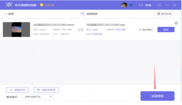 3、添加好要进行转换的视频文件后,选择输出的格式为mp4,最后点击【全部转换】按钮,就可以把webm转换成mp4格式了。