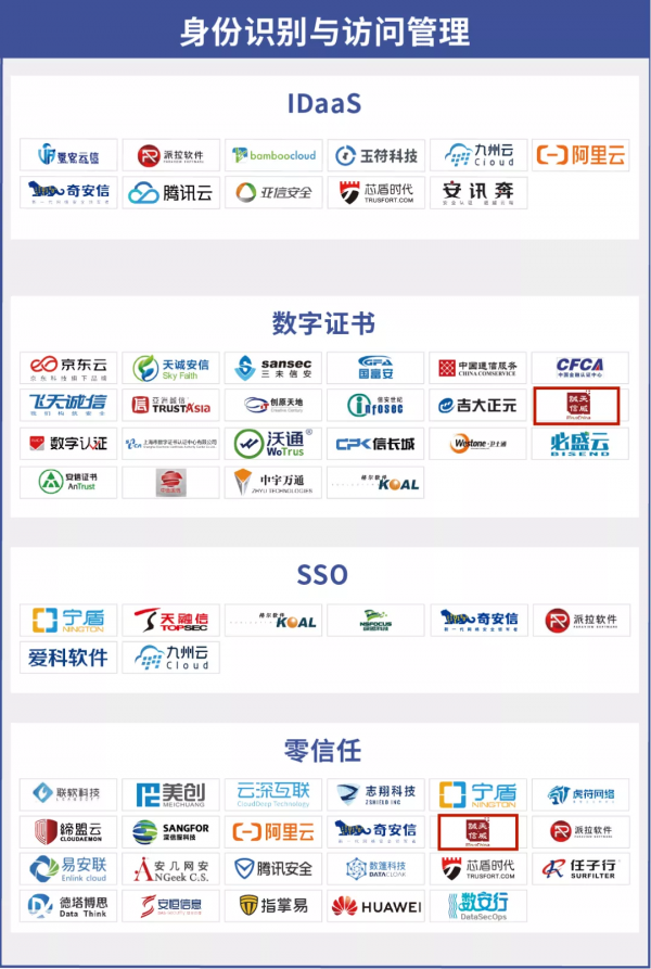 天威诚信入选身份识别与访问管理 中的数字证书 和零信任 两个模块。