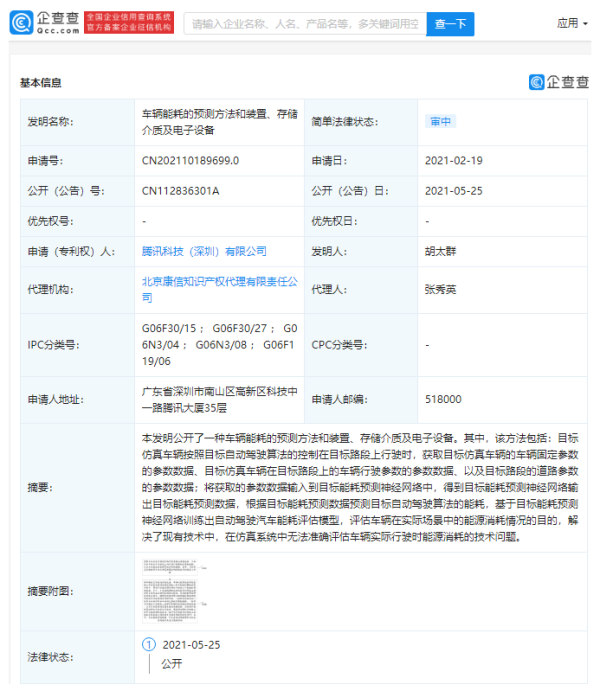 A5创业网(公众号:iadmin5)5月25日报道:企查查App显示,5月25日,腾讯科技(深圳)有限公司公开“车辆能耗的预测方法和装置、存储介质及电子设备”专利,公开号为 CN112836301A。