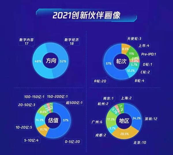 35家2021创新伙伴,覆盖了工业互联网、智能交互、虚拟/增强现实、未来网络等12大5G场景,总估值近1000亿元,其中数字内容和数字经济分别占比48%和52%。在城市分布上,深圳排名第一,体现了深圳在5G领域的创新先行和活跃。北京、广州分别排名第二、第三。融资和估值上,创新伙伴以A轮和B轮创新公司最多,也涵盖多个估值百亿的龙头企业。