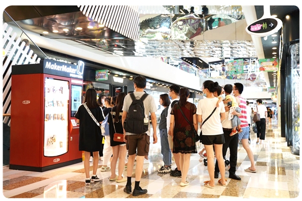 玩壳工厂(MakerMaker)自2019年底开始投放西单大悦城等北京年轻潮流商圈,深受年轻潮流用户喜爱。它是一台1平米的全自动手机壳智造机,它能够根据用户需求,在3分钟内实时定制,现场机器人交付(这个好,再也不用捉急的等快递了耶)。而且最新研发第三代设备也正在北京商圈陆续上线(上周在通州万达商场里已经看到了,居然这么多人在排队)。