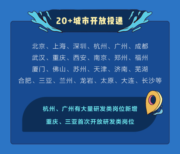 其中,北京、上海、深圳的招聘需求量最大,杭州、广州有大量研发类岗位新增,重庆和三亚将首次开放研发类岗位。此外,成都、武汉、西安、南京、郑州 、长沙、厦门、大连等热门城市也有大量岗位提供。毕业生可登录字节跳动校招官网,在“城市”栏中了解所在城市招聘岗位需求。