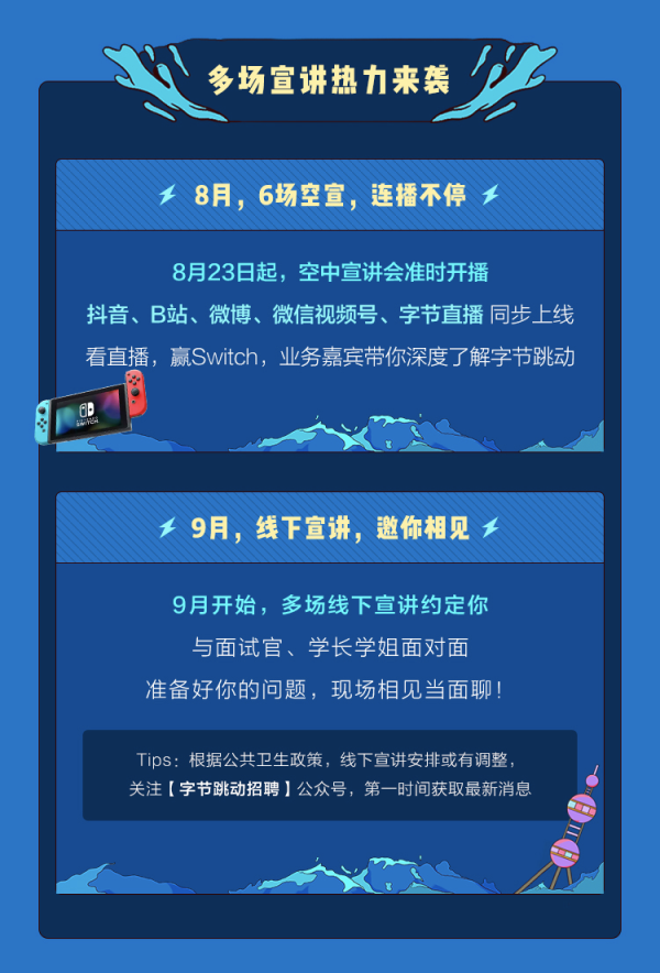 本次秋季校园招聘将持续两个多月,于10月31日结束。目前,相关岗位招聘信息已在字节跳动校园招聘官网公布。为帮助广大毕业生找到合适岗位、提升入职机率,字节跳动将继续开放2次投递机会。8月至9月,字节跳动将陆续推出多场空中宣讲及线下宣讲活动,申请者可登录字节跳动校招官网及相关官方社交账号了解详情。