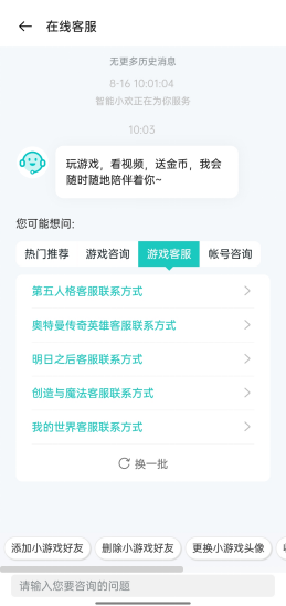 为提供更便利的咨询体验,欢太科技积极完善用户服务体系,并结合其他平台在线服务案例,搭建多条在线服务通道。用户不仅可以通过关注欢太客服公众号,从微信端联系欢太客服,还可以在欢太科技推出的多个应用上进入在线服务咨询。以欢太小游戏为例,用户可以打开欢太小游戏“我的”页面,点击“帮助与客服”即可进入在线服务。