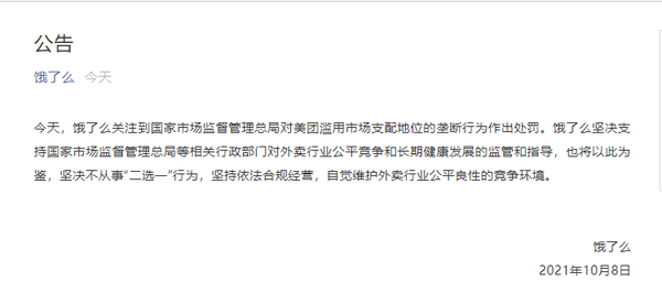 就在刚刚,针对美团被罚一事,饿了么表示,关注到国家市场监督管理总局对美团滥用市场支配地位的垄断行为作出处罚。饿了么坚决支持国家市场监督管理总局等相关行政部门对外卖行业公平竞争和长期健康发展的监管和指导,也将以此为鉴,坚决不从事“二选一”行为,坚持依法合规经营,自觉维护外卖行业公平良性的竞争环境。