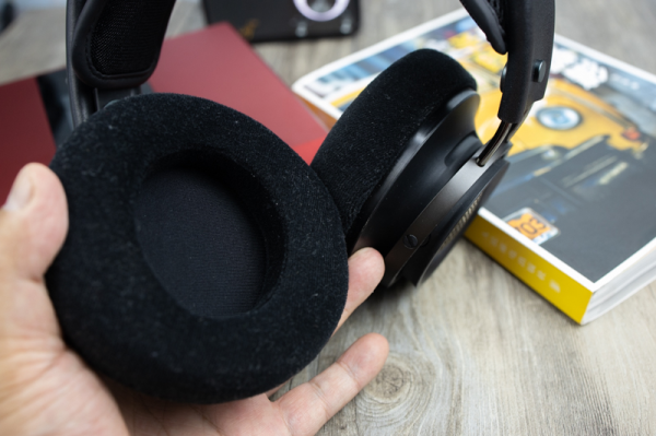 天鹅绒的包耳材料,面料有均匀的绒毛,可以完全包裹耳朵但不闷,还可以起到隔音降噪的效果。有朋友说天鹅绒容易沾灰,其实这更能说明Fidelio X2HR的真材实料,日常使用完毕后可以上某宝购买二十块的耳机盒(有的还送耳罩,双重保护)保护起来,耳垫也可以拆下来清洁,效果如下图,看起来还是挺干净的。