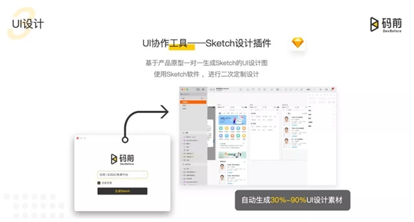 「码前」支持 UI 协作工具的集成,对 Sketch 设计插件进行了很好的融合,可以直接在 Sketch 上直接导入原型,设计师就可以基于原型进行二次定制设计了。