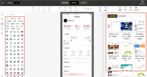 如果想快速构建一个页面,还能直接从已有的原型模板里去选。比如你想要一个金融产品的详情页面,直接选一个模板在它的基础上修改就好,不用重头开始画。