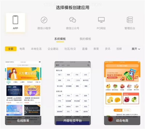 目前,已经支持电商、O2O、社区、社交、视频、直播、资讯、教育、IoT、医疗等十多个行业的模板。