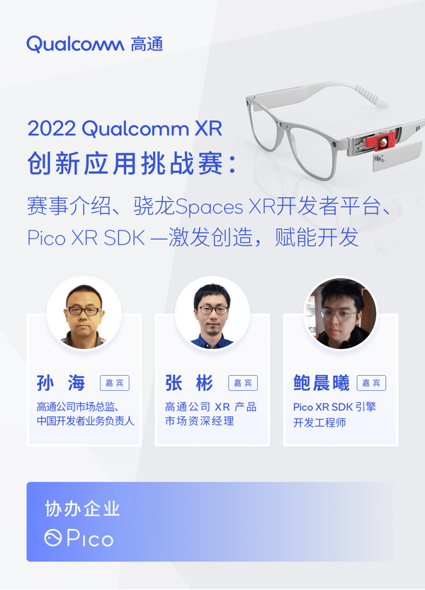 2022 Qualcomm XR 创新应用挑战赛第一期在线公开课将于4月7日20点举行,本次公开课由高通公司市场总监兼中国开发者业务负责人孙海、高通公司XR产品市场资深经理张彬 、Pico XR SDK引擎开发工程师鲍晨曦主持,主题为『赛事介绍、骁龙Spaces XR开发者平台、Pico XR SDK——激发创造赋能开发』。
