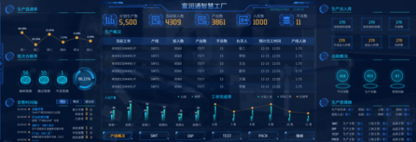 在富润通科技一楼的数字化运营大厅,首先映入眼帘的是一个巨大的电子屏,上面跳跃的是从“人机料法环”各个环节采集的、经过分析后的实时数据。管理人员通过这些数据,即可实时监控整个生产及做出响应的决策。