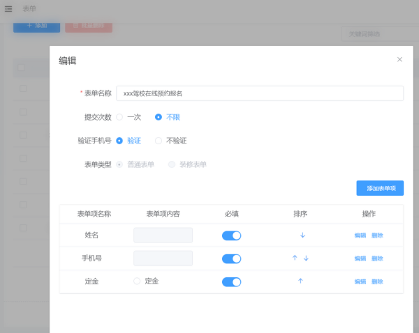 步骤三,在表单编辑页面,我们需要编辑表单名称、勾选提交次数,就是每个用户可以提交几次报名,可以勾选一次和不限,然后勾选是否需要验证手机号,表单类型勾选普通就可以了,接下来就是报名链接制作的核心部分了。