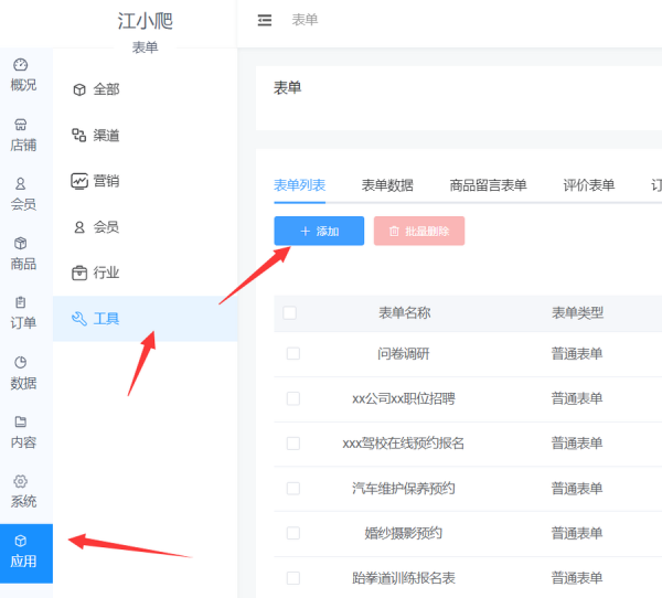 步骤二,小程序添加成功之后,点击小程序名称就可以进入报名链接制作后台,在飞多多智慧小程序的应用中,找到表单,直接点击添加就可以进入表单制作页面了。