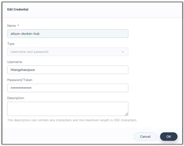 上图中,笔者创建一个名为 aliyun-docker-hub 的凭证,用户名是我的阿里云账户名,密码则是申请容器镜像服务所创建的密码。 读者需要替换成自己的账户密码: