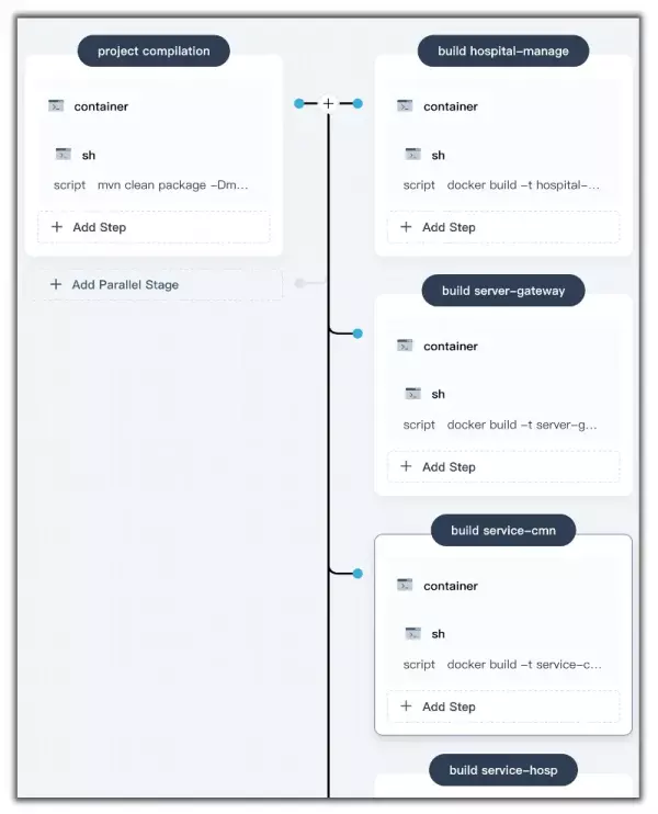 因为上述 10 个镜像的构建相互之间独立,因此可以并行化执行。我们可以很轻易地在 KubeSphere 中做到这一点: